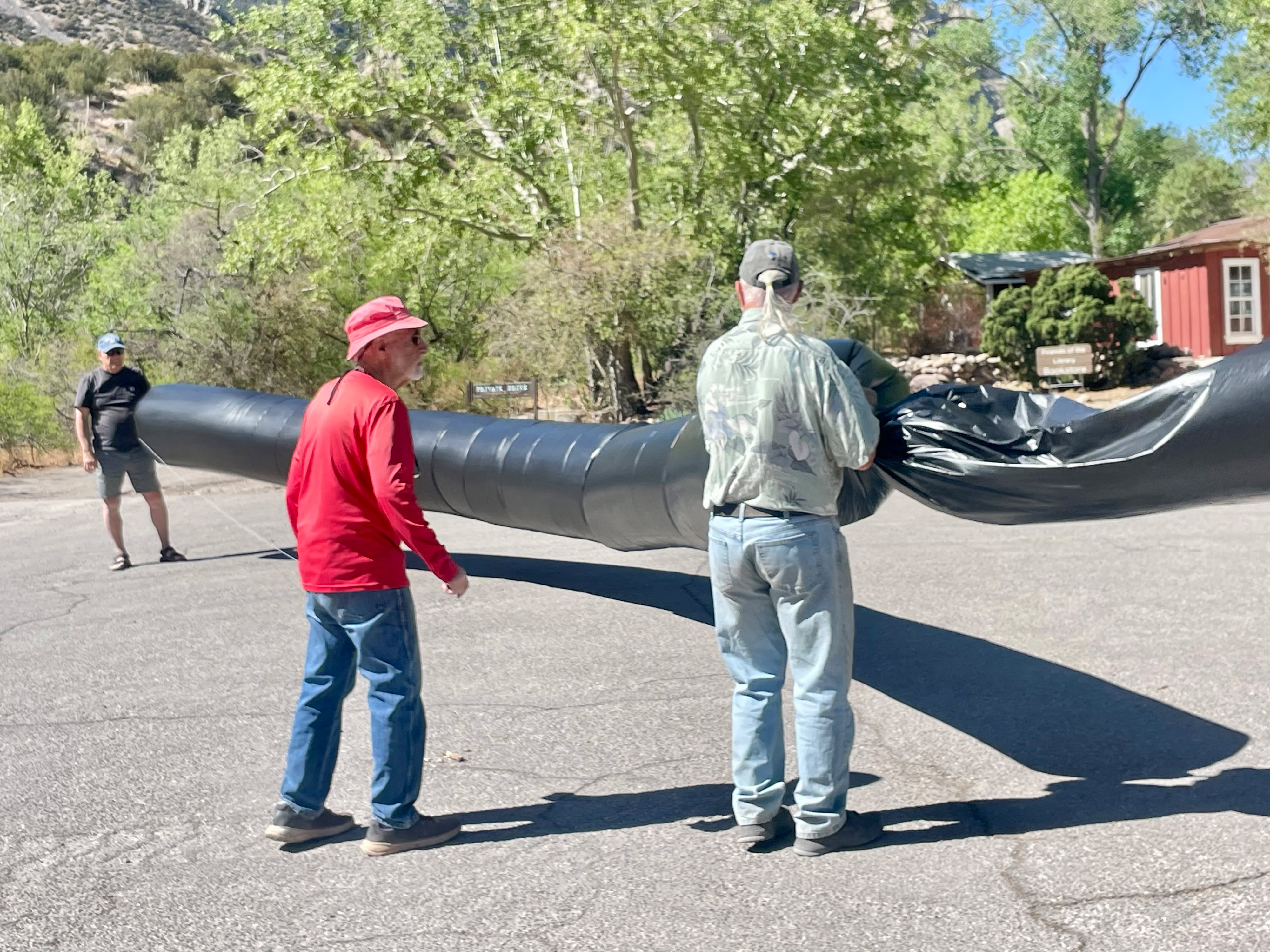The science behind this event is the same as a hot air balloon. But instead of using a fire to heat the air inside the balloon, the black plastic skin absorbs sunlight and converts light into heat. The heated air inside is less dense than cooler air outside and the balloon rises. To keep the long object as light as possible, the plastic skin is paper thin. After about 20 minutes, one end blew against some branches of the sycamore tree and made about 5 tears in the balloon. That end was cut, the new end sealed and our 55-ft balloon became a 45-ft balloon. Still, it had enough lift to excite the people at the Farmers Market. One person tried to straddle it, but their 100+ pounds was a bit too much for liftoff.