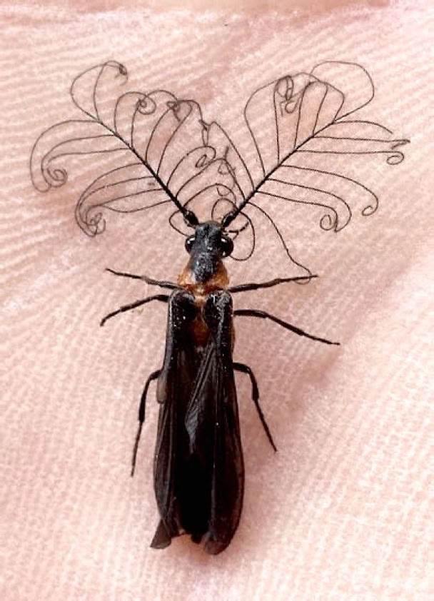 So, what does this have to do with the beetle. The photo (top of page) shows an adult female phengodid. She still looks like larva. She is a neotenic insect which keeps its larval anatomy through adult life. The male larva develops into an insect that looks like a normal adult beetle (albeit with a very cool set of antennae).