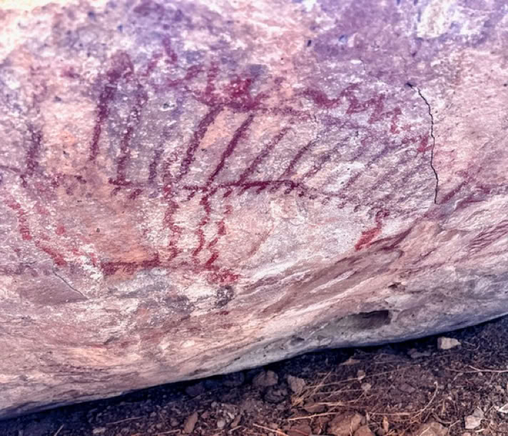 The rock art we saw was always protected from the elements under rock overhangs like the one below. At several sites we found a combination of geometric shapes, animal figures, humanoid figures and random lines, all painted in red on back walls or ceilings.