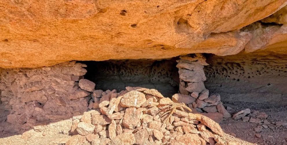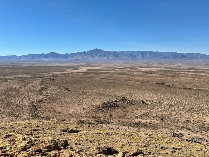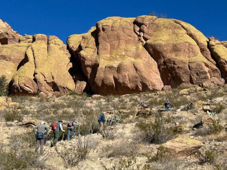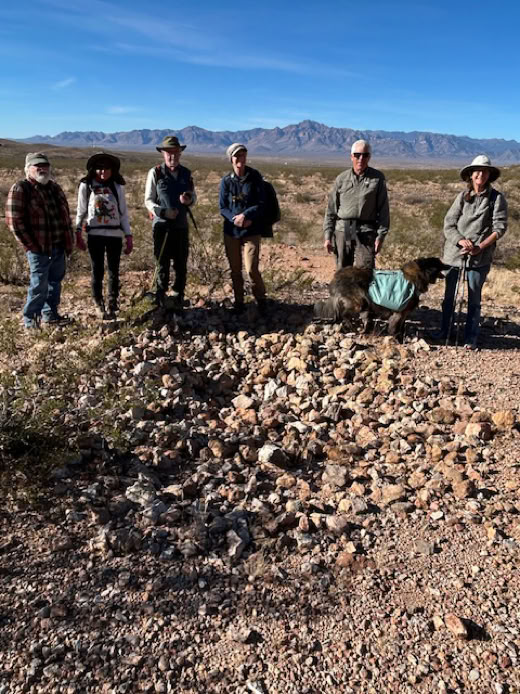 This was a day to remember those who lived here long before us. We encountered an agave roasting pit, many bedrock grinding mortars, various collections of rock art, an arrowhead and a granary. Starting at about mile marker five on Route Nine in the Antelope Pass area, seven hikers crossed a long expanse of Chihuahuan Desert to climb up to rocky cliffs along the Peloncillo Mountains. Below you can see six of these hikers standing at an agave roasting pit and the vast expanse of desert with the Chiricahuas in the background.