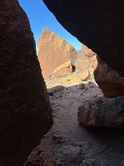 Following faint deer trails through a cluster of giant boulders we found our way to the bedrock slope that is the route to the fifth Native American archaeology site of the day. Hidden in a small alcove above several terraces is a partially constructed room. Supposedly the rock and adobe structure was meant to be a granary, built to store foods, safe from animals and people. With a great view of the valley, we chose to have lunch on the "front porch.”
