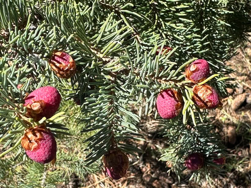 It was rather green from last week’s rain and some of the aspen are leafing out! I imagine It will be a hot summer, but we are all breathing a sigh of relief about getting some rain this spring. So happy to see wildflowers blooming, lizards sunning, and cones coming out on the Engelmann Spruce: