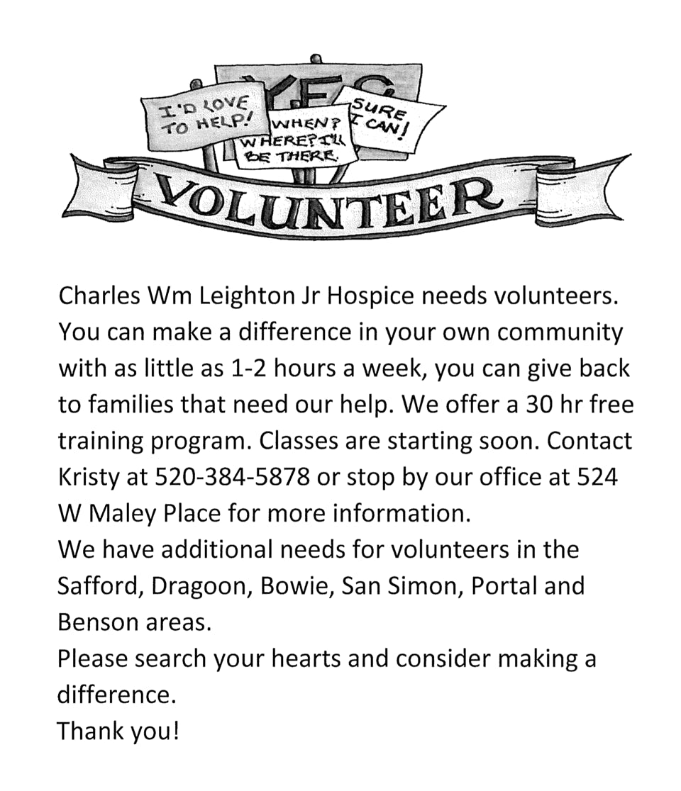 For more information about volunteering, contact Kristy Alexander: 520-384-5878 and read about our local Hospice: www.willcoxhospice.com