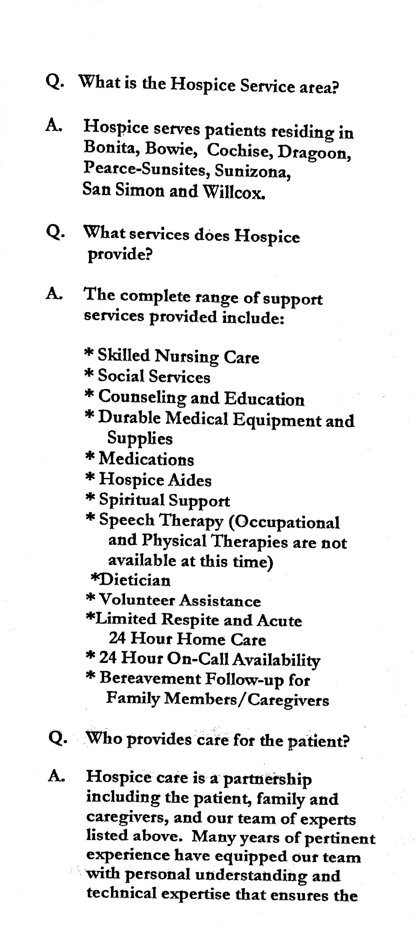 Our Portal portion of Charles W Leighton Jr. Hospice is currently staffed by Frances Grill NP (Medical lead), an RN, and a CNA who both live in the Portal-Rodeo area.