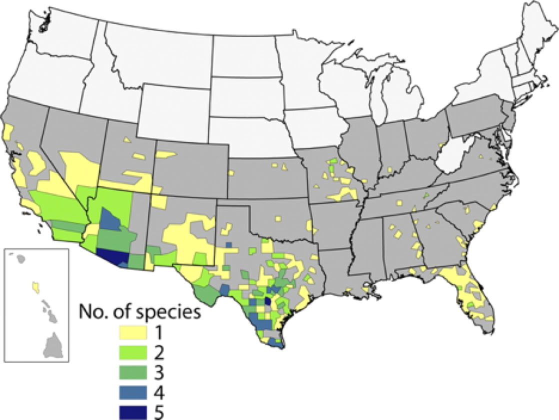 (Colors Denote Number Of Kissing Bug Species)
