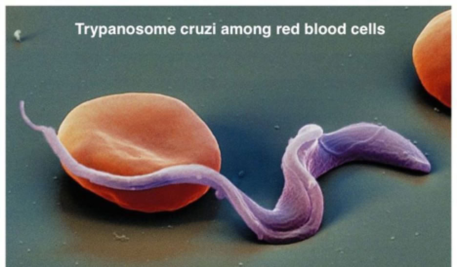 Chagas disease (named after the Brazilian physician Carlos Chagas), is caused by the protozoan parasite Trypanosoma cruzi (see photo below), which is transmitted to animals and people by kissing bugs and is found only in the Americas (mainly, in rural areas of Latin America where poverty is widespread).