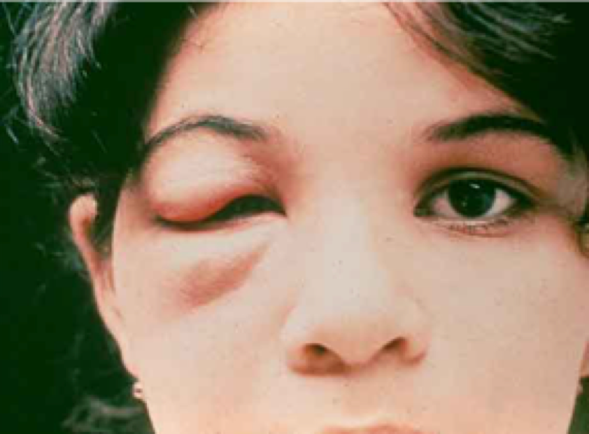 A particularly interesting symptom of the acute phase is called the Romañia sign, a preorbital swelling of the eye (see photo below). The Romañia swelling can also be present without being infected, as part of the allergic reaction following a bite near the eye,
