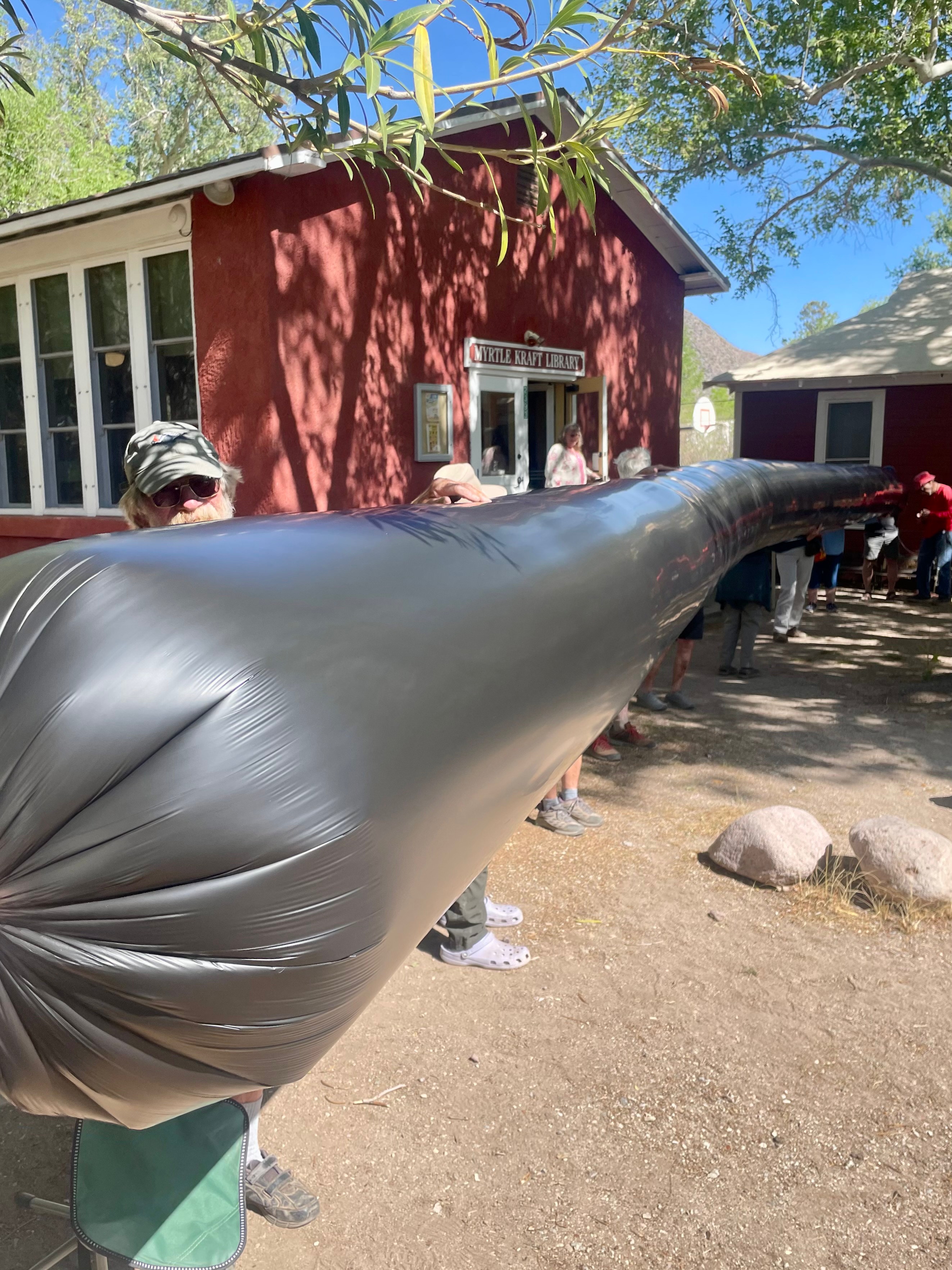 The weather was perfect on the morning of April 26, 2025. Just a pleasant breeze. 15 people lined up in the shade outside the library to hold the 55 ft long balloon while it was inflated with a leaf blower. One end was tied with a string and we all walked out into the sun.