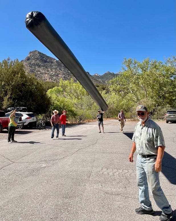 The science behind this event is the same as a hot air balloon. But instead of using a fire to heat the air inside the balloon, the black plastic skin absorbs sunlight and converts light into heat. The heated air inside is less dense than cooler air outside and the balloon rises. To keep the long object as light as possible, the plastic skin is paper thin. After about 20 minutes, one end blew against some branches of the sycamore tree and made about 5 tears in the balloon. That end was cut, the new end sealed and our 55-ft balloon became a 45-ft balloon. Still, it had enough lift to excite the people at the Farmers Market. One person tried to straddle it, but their 100+ pounds was a bit too much for liftoff.