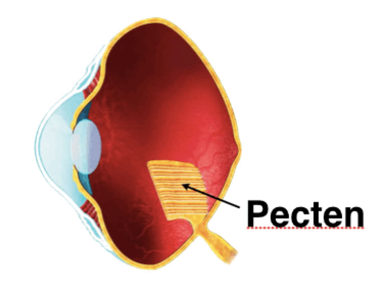 The Pecten (see diagram) consists of folded tissue and is filled with melanin granules ( the same pigment that darkens our skin and hair - well, it used to darken MY hair). It projects from the retina into the vitreous, is well supplied with blood vessels and keeps the retina supplied with oxygen and nutrients.