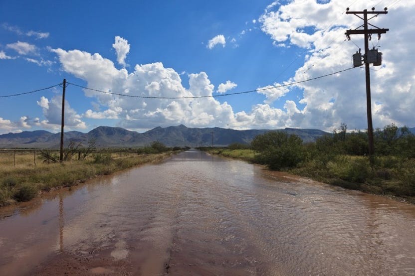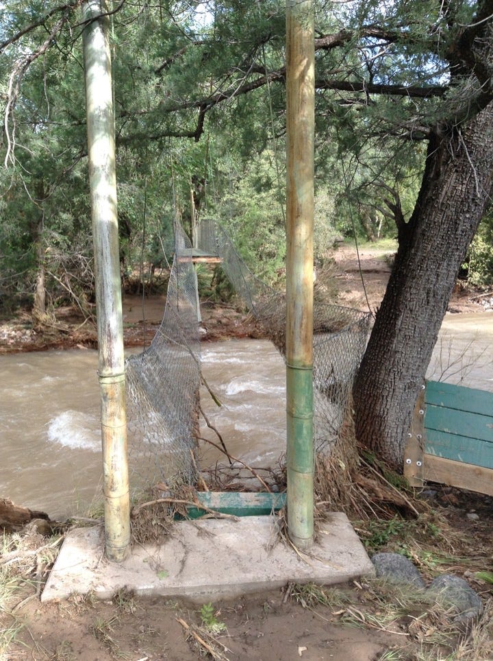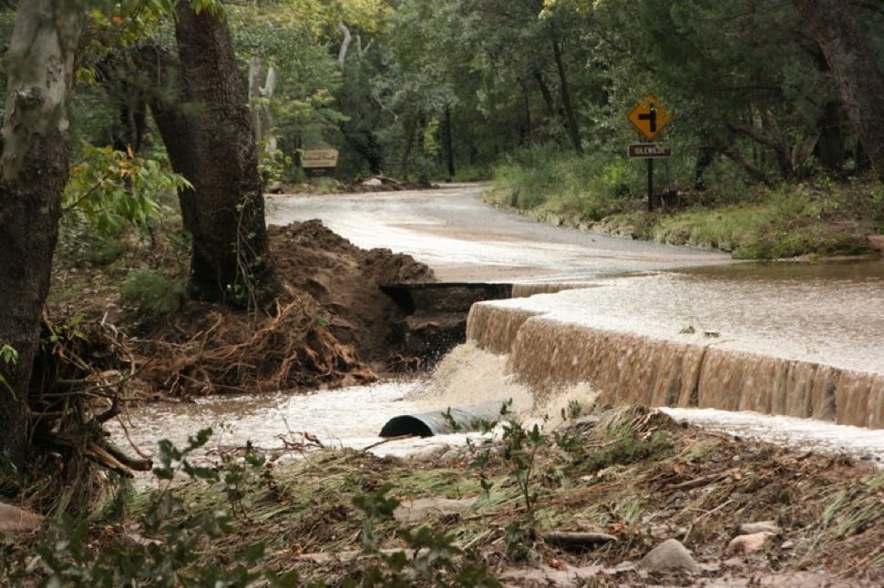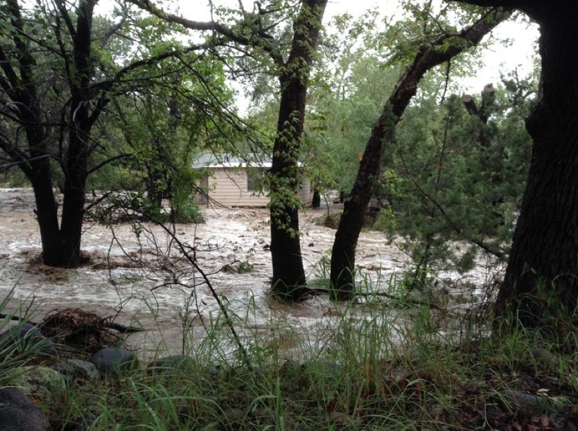 ‍The Forest Service is calling it the 500-Year Flood. Others are comparing it to Katrina, Johnstown Pennsylvania, and Noah. Whatever - we had water where no one living here today remembers water! New creeks popped up everywhere. On September 17, twostorms fromBaja created a deluge the likes of which we have never seen. Fortunately, as far as I know, only the creek-side cottages of Cave Creek Ranch had serious indoor flooding. There are reports that some of the straw bales in Morgan & Johns’s new house were wet. This page will begin to tell the story in pictures, stories and even song (if someone sends me a song). But, as they say, you had to be here to believe it!