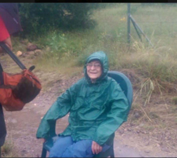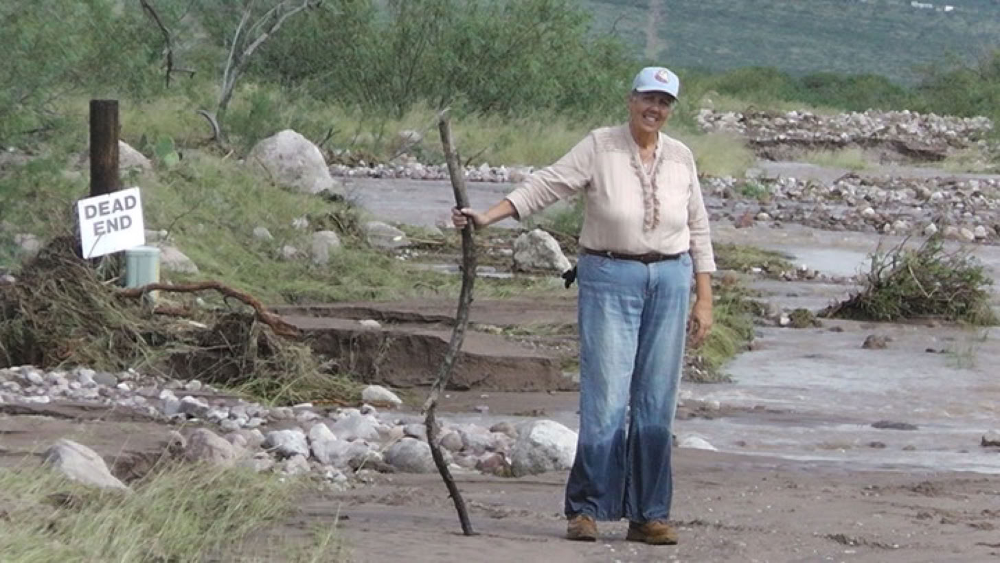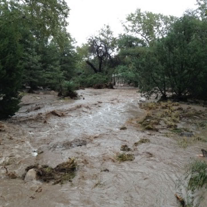 At about 6:30 am on Thursday (September 18), two Border Patrol agents, a representative from the Sherriff’s office and Walter Schoepfle transported Gloria from her house to mine. The creek was up against the very edge of her porch, but no water entered the house. The Sheriff snapped this photo and sent it off to NBC news. By the time it was aired, the story said that Howard Topoff had rescued not just Gloria but two women, water up to their knees, and the house heading down stream. We are still looking for the second woman, who may have been relocated under the Witness Protection Program.