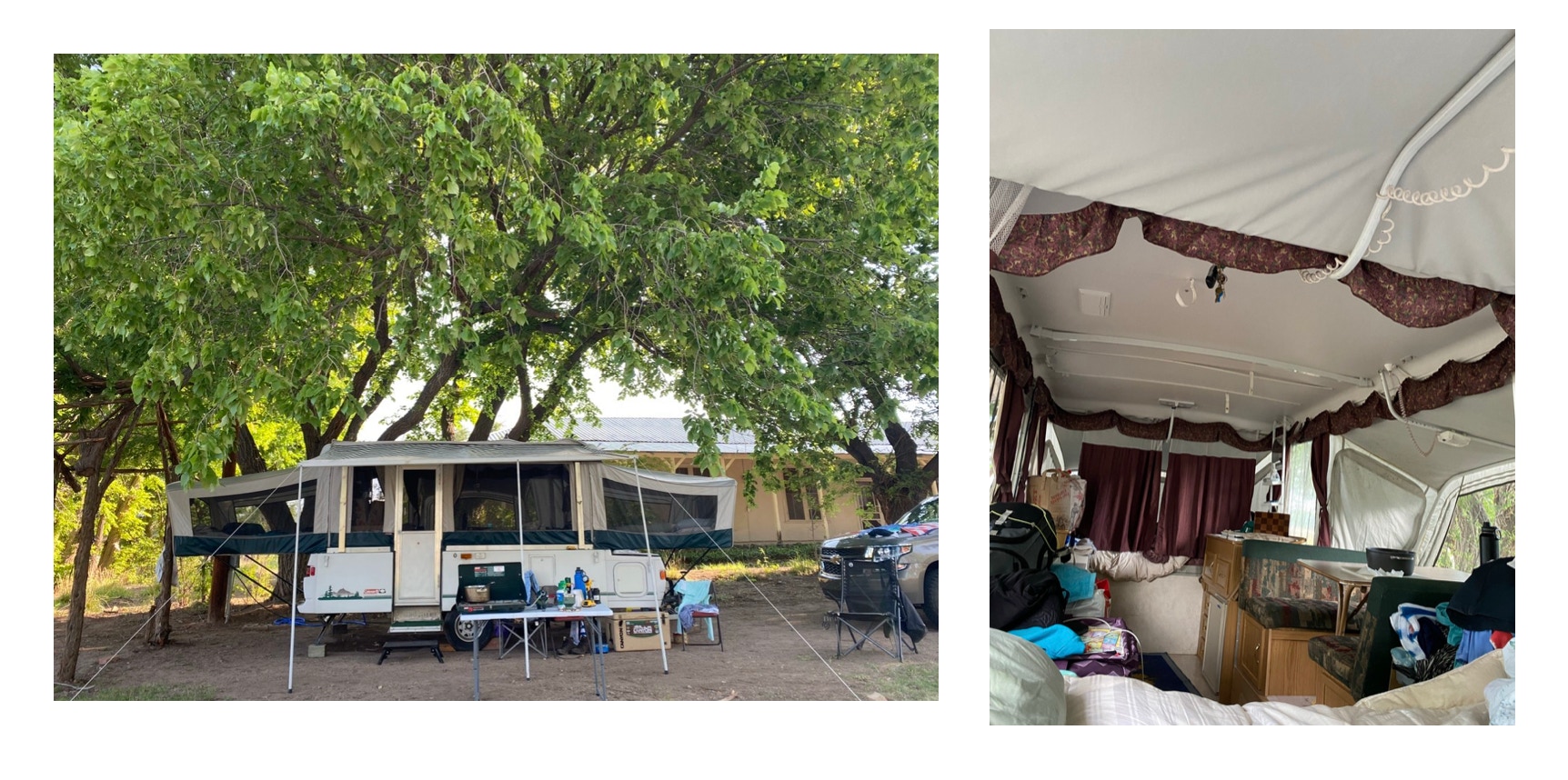 It has two slide out king beds, toilet/shower, pop out dining area, water pump needs to be replaced, and it has no heat or A/C.
