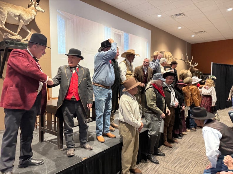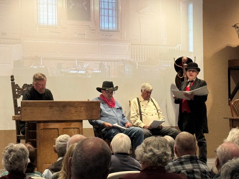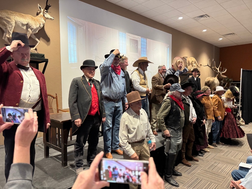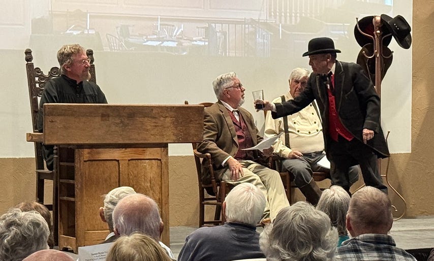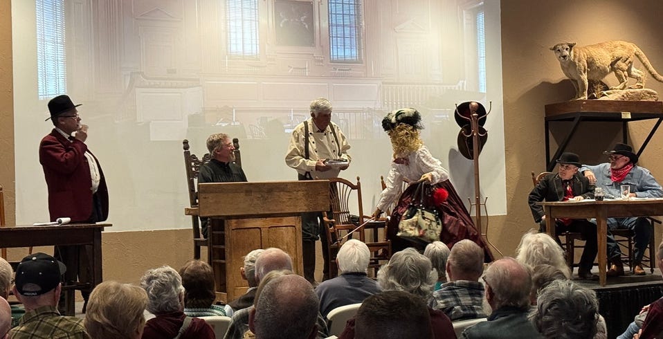 Ninety-three people showed up, for a live play performed at the Geronimo Events Center. It was written and directed by Dave Thomas. Some of the main roles were Judge Frank Parker portrayed by Dan Crow of Las Cruces, Prosecuting Attorney Thomas B. Catron portrayed by Craig McEwan, Defense Attorney Albert B. Fall played by Bill Cavaliere, Eva Taylor played by Karla Steen of Las Cruces, Oliver Lee portrayed by Sal Patricolo of Las Cruces, Albert Fountain Jr. played by Jesse Bradfield, Dr. Francis Crosson played by Ray Mendez, Thomas Brannigan portrayed by Edward La Russa, Antonio Garcia played by Bill Wilbur, Jack Maxwell played by Scott Huber, and Sheriff Pat Garrett portrayed by Bob Ashley.