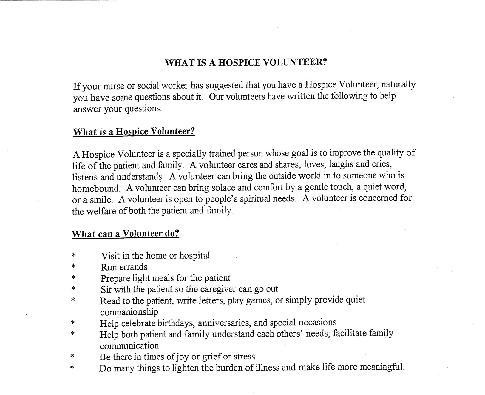 7. Hospice volunteers do not do personal care.Assistance type is solely the volunteer's choice.It can involve direct patient interactions (visiting, reading, writing notes, listening, watching TV together, providing quiet companionship).Or it can involve helping the family or caretaker, as they need social visits too, time to run errands or just get outside.Indirect tasks can range from helping in the house or yard, grocery shopping, removing trash, preparing/delivering simple meals, doing light housekeeping or even working in the Hospice office.