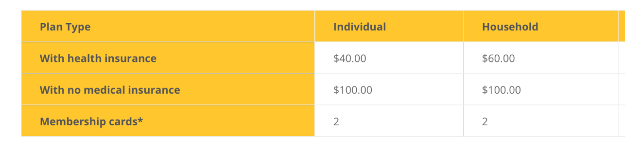 Health insurance is not required, however the membership rates are $100.00 for an individual or household national membership with no insurance. Please note: Medicaid members are not eligible to enroll in this program*.