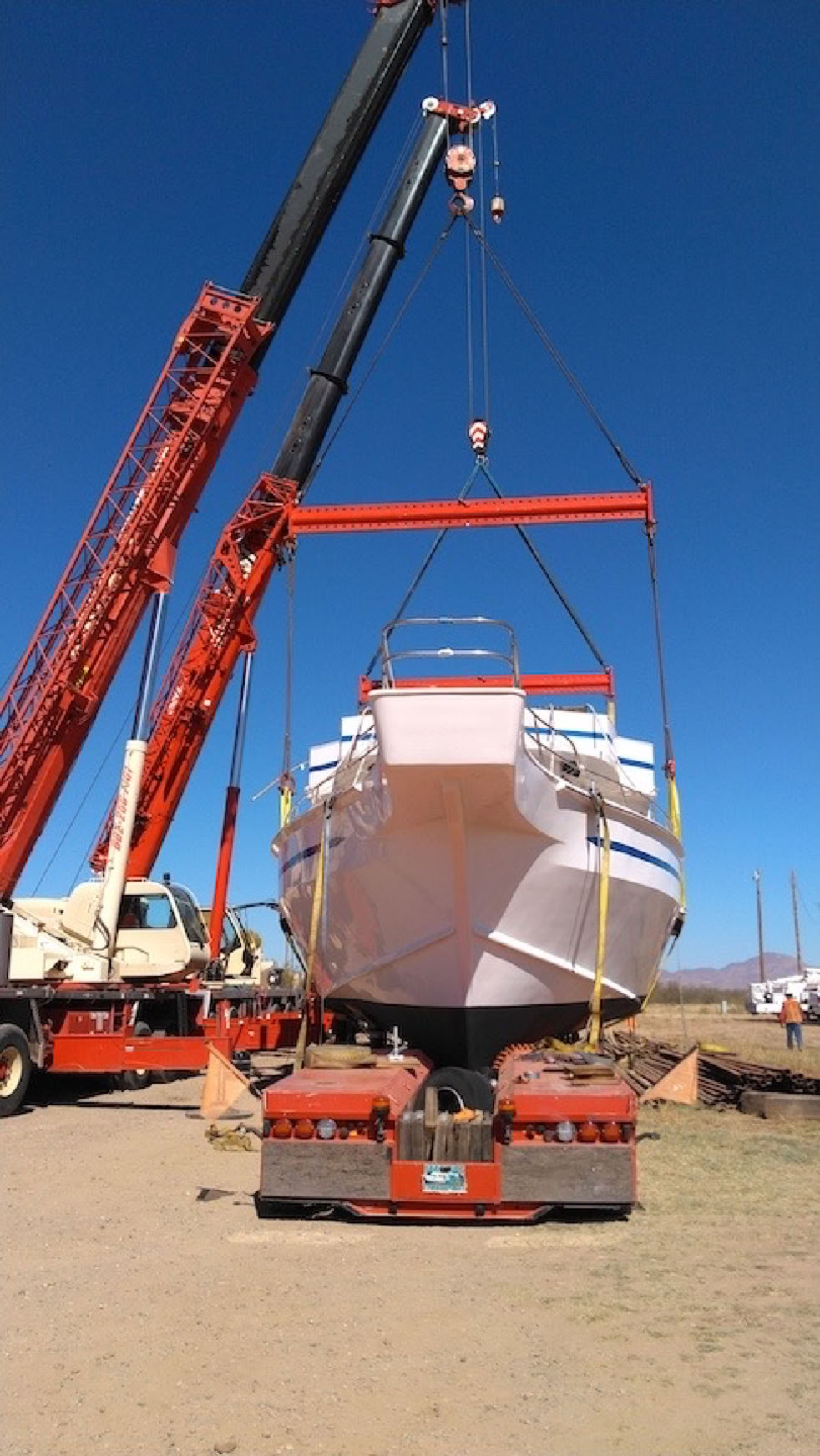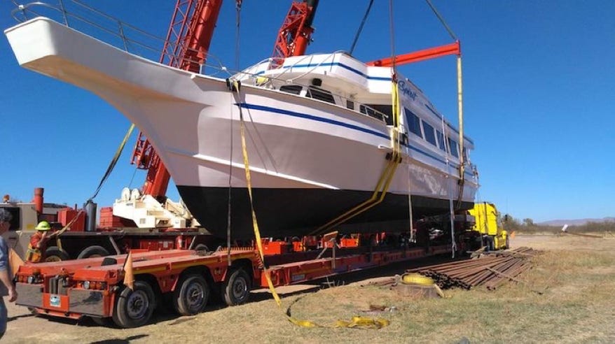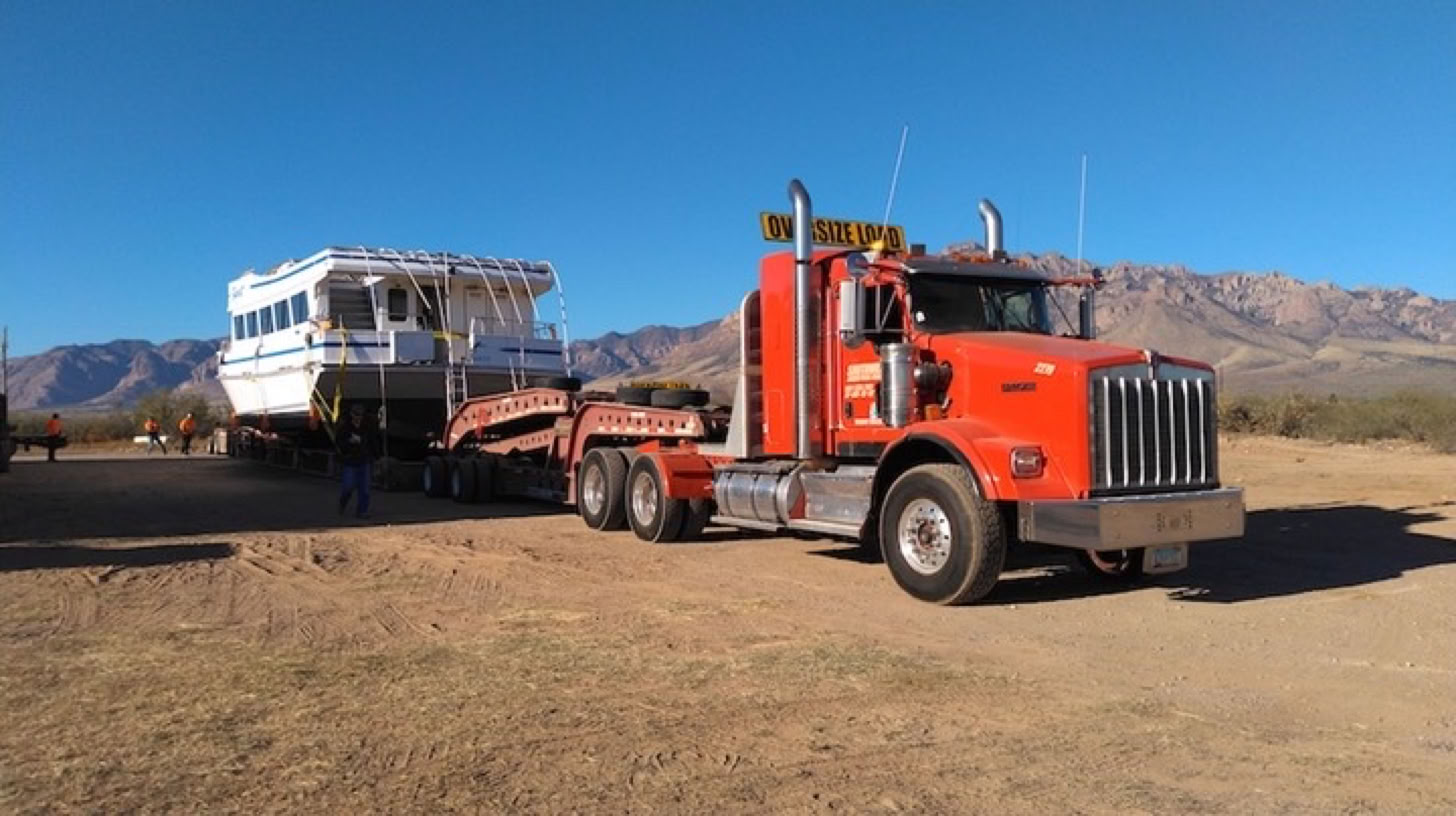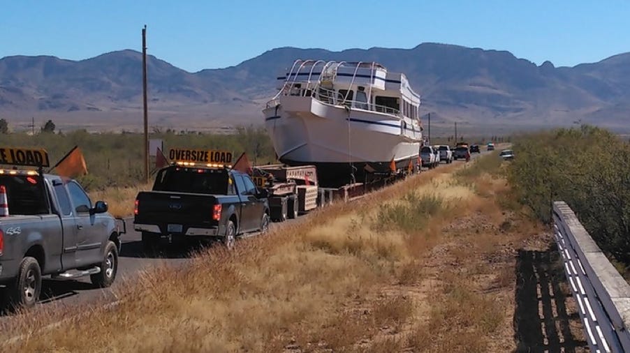 The boat is a 75', 45-ton yacht called the Spirit of Tahoe. It was purchased by Mike Dunham in Ft. Meyers, FL. with plans to use it as a sight-seeing boat on Lake Tahoe, along with his other (larger) boat that has already been there. It was sailed across the Gulf of Mexico to Galveston,Texas, then put on a flatbed wide-load trailer. The driver missed his delivery deadline, temporarily parked it on Highway 80 and came up Portal Road with his escort driver looking for a place to park it. It was never on my property but instead on my neighbor Victor Lopez's. The driver asked Victor's employee if he could park it there until he could get the permits for Arizona. He left it there and was never seen again.